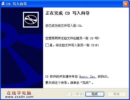 4、文件很少只有1MB多一点,很快就完成了刻录过程并出现已经完成的提示。这时如果要刻录多一张一样的光碟就勾选“是,将这些文件写入到另一张CD”。