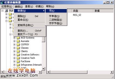 同样地,我们也可以在注册表的菜单栏中的【编辑】菜单下,单击【新建】菜单项下的【项】菜单命令,如图1.13所示,这样的操作结果同在窗口中单击右键创建项的结果完全一样。