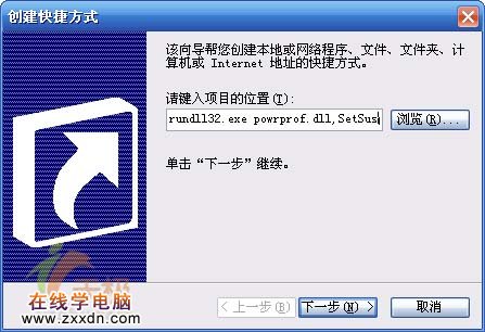 3.在“创建快捷方式”对话框中输入“rundll32.exe powrprof.dll,SetSuspendState”,如图1所示。