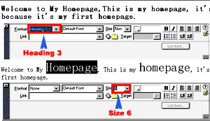 Format:设置文字大小,Paragraph 属性可以使选中文字独自成为一个段落,Heading 1 ——Heading 6 用来控制文本大小。在 HTML 源代码中,Heading 被简化为 H ,Heading 1 就写成 H 1 ,在这几种格式中, H 1 字体最大,H 6 字体最小。它们的区别如图二: