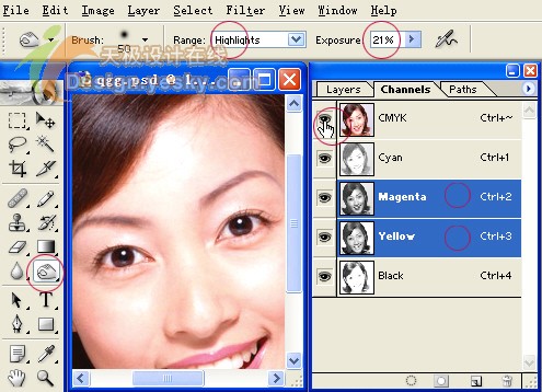 3.变为cmyk模式后,在工具栏中选择加深工具,在上面的Range范围选项中选择Highlights高光,设置一个较低的值,笔刷用柔角的。