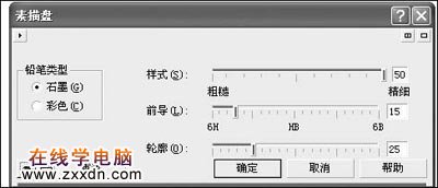 与PS的素描相比,CD的此项滤镜可调节性更大,细节更精致。点选菜单命令“位图→艺术笔触→素描盘”,弹出如图3所示的控制面板,建议将样式选为“精细”。设置完成后按下确定,效果如图4所示。