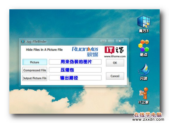 在线学电脑(www.zxxdn.com):Jpg+FileBinder 1.0:将文件隐藏进图片中